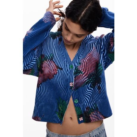 ピクセル風の花柄が施された軽量ニット素材のカーディガンスタイルのセーター。