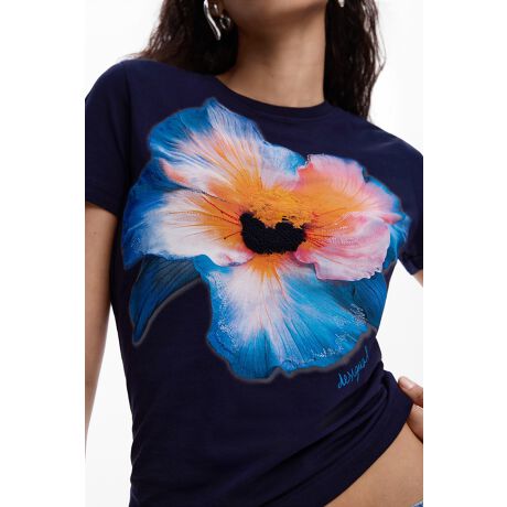 大きな花のプリントが前面にある、タイトなフィットのクルーネック半袖Tシャツ。