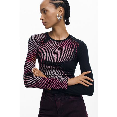 ニット素材の長袖Tシャツ、丸首。黒、白、ピンクのトーンで曲線のグラフィックプリントが施されています。