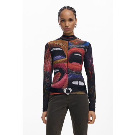 マルチカラーのグラフィックプリントが施された、体にフィットするスリムフィットの長袖タートルネックニットシャツ。