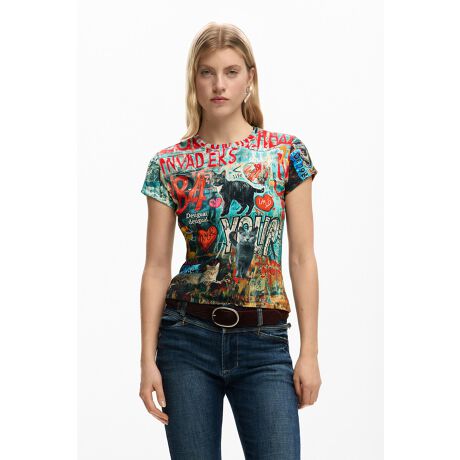 グラフィティ風の総柄がプリントされた半袖Tシャツ。