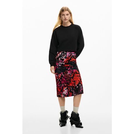 リサイクル素材を使用したMr. Christian Lacroixデザインのニットワンピースで、赤と黒の色調の抽象的なプリントが施されています。クルーネック、長袖、ミディ丈で、ボディラインにフィットするスリムシルエットです。