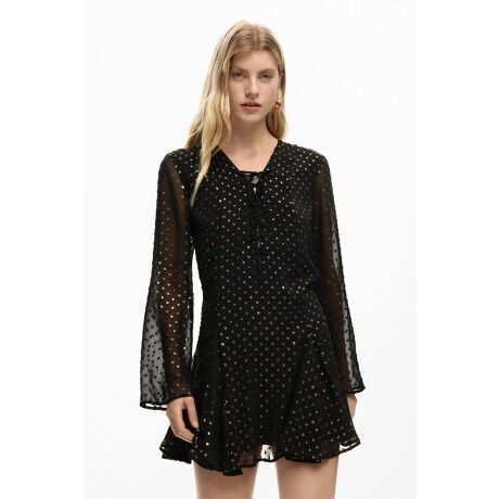 長袖のドレスで、輝くプルメティ生地と暗いトーンの均一なプリントが特徴です。Vネックと前ボタンが付いています。ウエストが絞られたデザインで、ボリュームのあるスカートです。