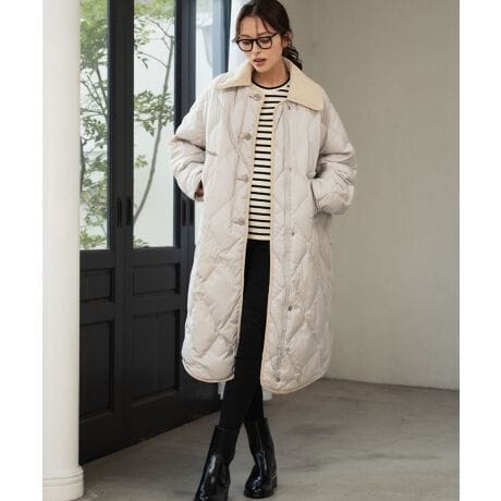 中わたにダウン90%を使用した、軽くてあたたかいキルティングのロングコート。