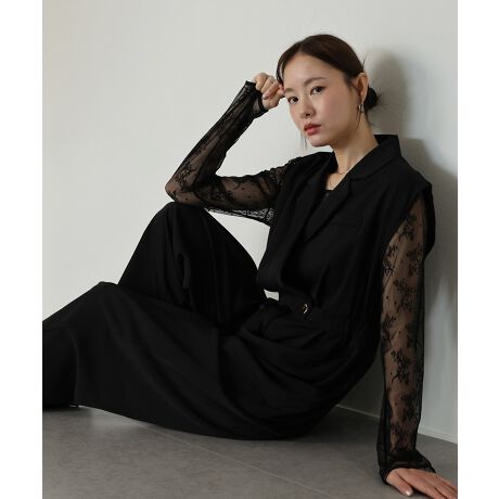 テーラードオールインワンパンツドレス+ジャガードチュールトップス 結婚式 パーティードレス 成人式