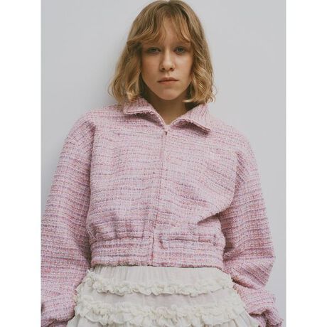 トレンドのスポーツテイストのトラックブルゾンですがFURFURらしくツイードカットソー生地でフェミニンな雰囲気で作成しました。綺麗めな見え感ながらカットソー素材なので気軽に着用できます。ボトムは同素材のパンツ(RWCP261030)合わせもお勧めですが、ミニスカートやチュールスカートと合わせて甘めなコーディネイトで着こなすのもお勧めです。