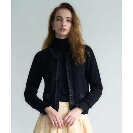 ネックラインから前立てにあしらわれたフリルが華やかな印象を与える、ジップアップ仕様のニットカーディガンです。フリル部分にはラメチュールを使用し、さらにビーズを施すことで上品な煌めきをプラス。冬のレイヤードにも使いやすいやや薄手の仕立てで伸縮性もあり、ジャケットのようなきちんと感とニットの快適な着心地を両立しています。羽織りとしてはもちろん、ジップを閉じてプルオーバー風に着こなすのもおすすめです。