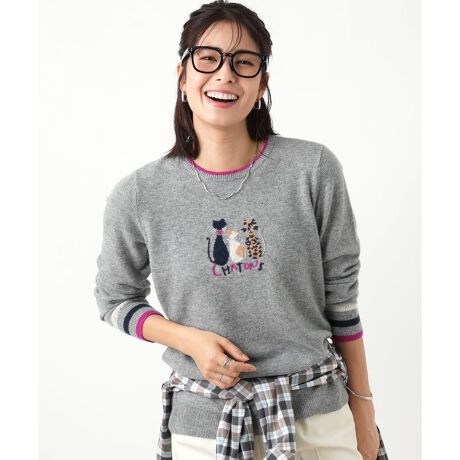 上質なカシミヤを使用した、暖かく柔らかな肌触りのクルーネックニットです。前身頃にインターシャ編みと刺繍、さらにビーズを組み合わせて描いた愛らしい猫のモチーフが目を惹きます。遊び心あふれるデザインはこれからの季節のコーディネートの主役に。首元と袖口にあしらわれた配色のラインも、スポーティーなアクセントをプラス。ピュアカシミヤのニット地は冬のレイヤードにも使いやすいやや薄手の仕立て。伸縮性にも優れており、快適な着心地が感じられます。