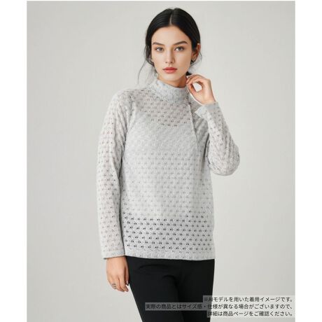 繊細な透かし編みが、エレガントな表情を演出するハイネックニットソーです。首元はリズミカルなループボタン開閉仕様で、クラシカルなアクセントを加えています。冬のレイヤードにも使いやすいやや薄手の仕立てで伸縮性を備えているため、快適な着心地を実感できます。袖口にはスリットが入っており、手元にさりげない抜け感をプラス。ジャケットやカーディガンのインナーとして、コーディネートを上品に格上げする一枚です。