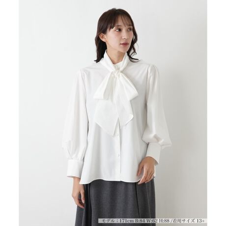 優雅なタイが付属した、スタンドカラーブラウス。コットン、ポリエステル、ポリウレタンをブレンドした素材は、適度なストレッチ性があり、快適な着心地です。スタンドカラーは首元をすっきりと見せ、洗練された大人の女性の品格を演出いたします。ご自宅で手洗いできるウォッシャブル仕様で、日常のお手入れも簡単。シンプルな無地デザインなので、タイの結び方一つで様々な表情をお楽しみいただけます。オフィスシーンはもちろん、お食事会や学校行事など、様々なフォーマルな場面で活躍する汎用性の高い一枚です。