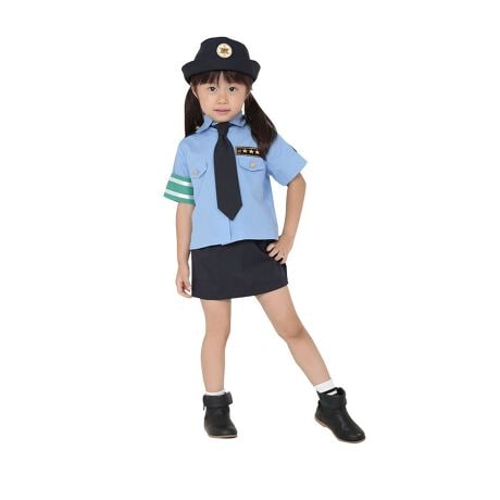 [型番:KI0008NB]かっこいい“ちびっこポリス”になれる、キッズポリス風コスチューム。淡いブルーのシャツにネイビーのスカート、ネクタイと帽子がセットになった本格デザイン。腕章風ラインやワッペンなど、細部までこだわったリアルな仕上がりです。ハロウィンや発表会、テーマパークイベントにもおすすめ!お子さまの勇ましくてキュートな姿を演出し、写真映えも抜群。元気いっぱいにポーズを決めれば、まるで本物のおまわりさん気分を楽しめます。