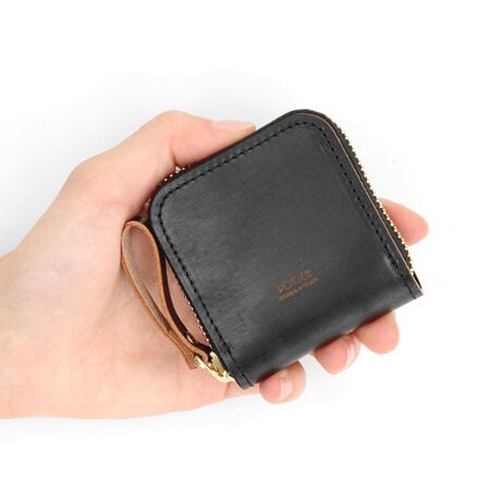 表面のガラス加工のブラックとヌメ革のコントラストを楽しめるように外装は切り目本磨き仕上げで、コバ部分を丁寧に磨いてからトップコートで仕上げており、内装も裏地を使わずに革のみで贅沢に仕立てています。