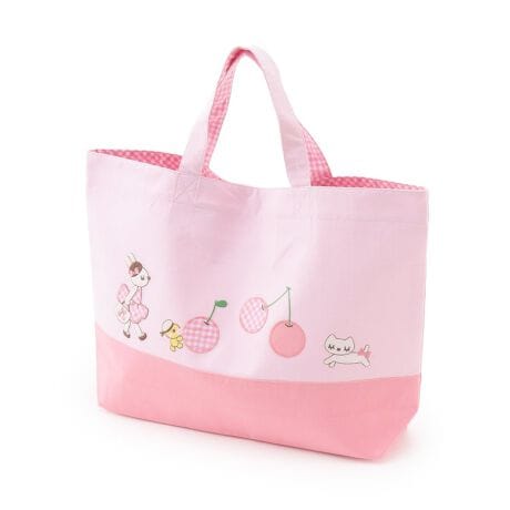 mimiちゃん、さくらんぼのアップリケ刺しゅうが可愛いレッスンバッグです。ギンガムチェックの裏地付き。口は、真ん中のスナップボタンで留められます。内側に、マチなしのポケットが付き、ハンカチやティッシュなどが、すっきり収納が出来ます。また、机のフックに掛けても引きづりにくい持ち手が、もう1組付いていて、学校等での使いやすさも考えた仕様となっています。A4サイズの教材やピアノのバイエル等、学校や習い事の必需品をまとめて持ち歩けるサイズ感。( 用途に合わせ、サイズ欄で寸法お確かめの上、ご検討ください。) おなまえの書けるネームタグも、内側に付いています。