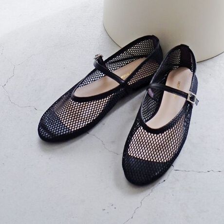 透け感のあるナイロンメッシュ素材を使用したストラップ付きバレエシューズは、春夏の足元に軽やかな印象に。