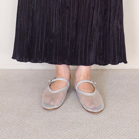 透け感のあるナイロンメッシュ素材を使用したストラップ付きバレエシューズは、春夏の足元に軽やかな印象に。