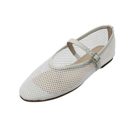 透け感のあるナイロンメッシュ素材を使用したストラップ付きバレエシューズは、春夏の足元に軽やかな印象に。