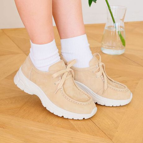 丸みのあるシルエットと太めのシューレースが、リラックス感のある大人カジュアルスタイルを演出します。