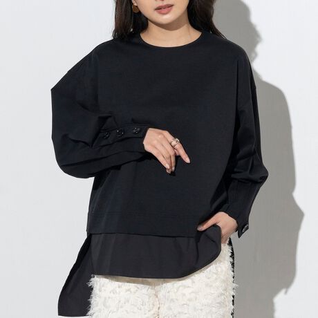これからの季節に丁度いい薄手のスウェットジャージーに裾からシャツを覗かせたようなレイヤード風のプルオーバー。スウェット部分はカジュアル見えしすぎないきれいめジャージ素材で、さらっとした肌触り。タックを取ったボリューム袖とボタンディティールがポイント。コーディネート要らずの楽チンアイテム。手洗い可能。