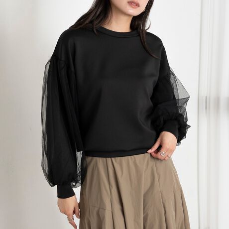 クリアな表面のジャージ素材で作るきれいめスウェットに、袖にチュールを重ねてボリューム感を出し、フェミニンで優しい印象のあるアイテムに仕上げました。適度なハリ感のあるモチモチした素材感で、ずっと着ていたくなるような着心地感。ドロップショルダーで身頃はややゆとりをもたせたシルエット。オーバーサイズになりすぎない丈感でさまざまなボトムに合わせやすいトップスです。シワになりにくく手洗い可能なので、デイリーに着まわせるアイテムです。