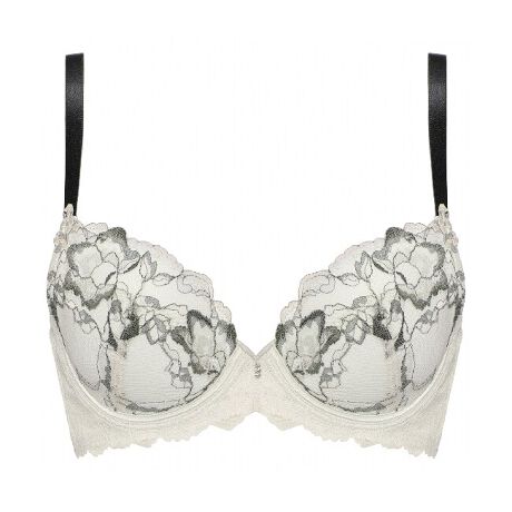 カップと背中にストレッチレースを使用し、ストラップの付け根にモチーフを使用したプレミアムらしい上品なデザインです。