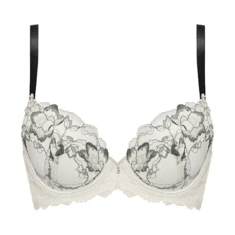 カップと背中にストレッチレースを使用し、ストラップの付け根にモチーフを使用したプレミアムらしい上品なデザインです。