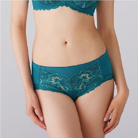 軽い印象のストレッチレースをフロントに、細いストレッチレースを脚口に使用した、はきこみ普通のショーツ。脚口は鼠径部に添ったスタイルの上品なプレミアムらしいデザインです。