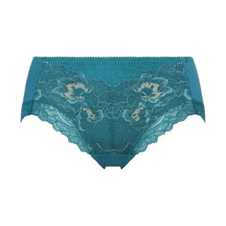 軽い印象のストレッチレースをフロントに、細いストレッチレースを脚口に使用した、はきこみ普通のショーツ。脚口は鼠径部に添ったスタイルの上品なプレミアムらしいデザインです。
