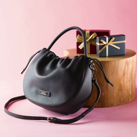 トレンドのラウンド型バッグに丸手のハンドルをあしらった、個性的なアイテム。