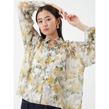 <b>【春を先取りする軽やかな素材に花柄をプリント。シャーリングも華やかなシアーブラウス】</b>