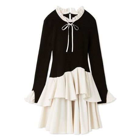 トップス部分はフィット感のある細リブニット、スカート部分にシャツ生地のティアードミニスカートをドッキングした配色使いが華やかなドッキングミニニットワンピースが届きました。襟ぐりにはスカート生地と同様のシャツ生地のフリルカラーと細リボン、袖口にもシャツ生地のフリルをリブニットにドッキングして、クラシカルなレイヤード風デザインに仕上げています。細リボンは取り外しが可能です。スカート部分は、動くたびにふんわりと揺れるシャツ生地の2段のアシンメトリティアードで今季らしくこなれ感を出しました。裾に向かって広がるシルエットで、美脚効果も抜群です。
