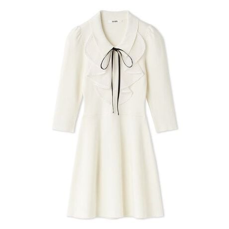 昨年も人気の前立て風デザインにオーガンジーフリルをドッキングしたニットトップスを、今季はミニワンピースにしてアップデートしました。7分丈の袖や、縫い目のないホールガーメントの立体的なスカートが、すっきりとしていて春先にも着やすいデザインです。今回は格子柄のレーステープを端に施したオーガンフリルを使用し、SNIDELでしか手に入らないこだわりの一枚に仕上がりました。シャープな衿とフェミニンなレースフリル、そして袖山のギャザーでふんわりとさせた袖が、愛らしさとキレイめの絶妙なバランスを演出します。襟下には、ボウタイ風にアレンジできるブラック細リボンをセット。リボンは取り外し可能です。