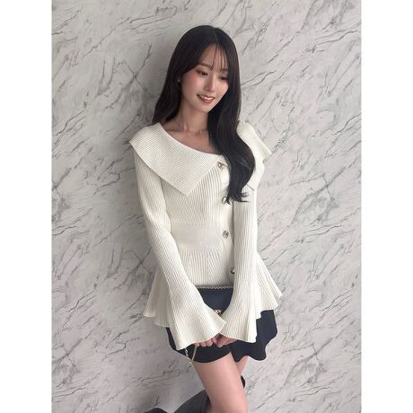 存在感のあるアシンメトリな襟元とウエストシェイプが目をひくペプラムカーディガンがお目見え。しっかりとした編み地のリブニットが程よく肉感を隠しながらも身体に寄り添いカーヴィーなラインを描き、美シルエットへと導きます。ワイドな襟元が顔まわりを華やかに。前立てには高級感のある艶めきメタルボタンを配置し、エレガントに仕上げました。アクセサリー無しでも華やかにキマります。ヒップにかかる丈感で、タイトなスカートやワイドパンツと好相性。春カラーを取り入れて、爽やかな仕上がりです。