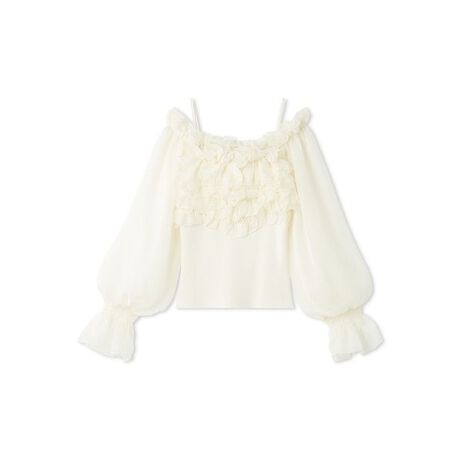 まるでレイヤードしているようなボリューミーなシアー素材のフリルが、胸元にたっぷりとドッキングされたニットプルオーバーです。ニットのキャミ紐を付けているのでオフショルでも安心してご着用いただける2WAYデザインです。袖もシアー素材で軽さを演出し、袖口はゴムシャーリングでふんわりと仕上げました。胸元のフリルは段によって分量を変え、ゴージャスで着やすいバランスを目指しました。デコルテの華奢見え効果も抜群。胸下からはフィット感のあるリブニットに切り替え、美スタイルに仕上げています。普段使いはもちろん、パーティーシーンにもおすすめな1枚です。