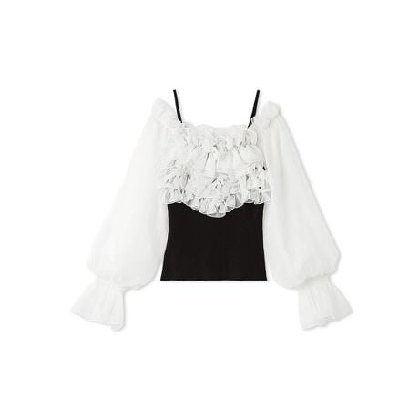 まるでレイヤードしているようなボリューミーなシアー素材のフリルが、胸元にたっぷりとドッキングされたニットプルオーバーです。ニットのキャミ紐を付けているのでオフショルでも安心してご着用いただける2WAYデザインです。袖もシアー素材で軽さを演出し、袖口はゴムシャーリングでふんわりと仕上げました。胸元のフリルは段によって分量を変え、ゴージャスで着やすいバランスを目指しました。デコルテの華奢見え効果も抜群。胸下からはフィット感のあるリブニットに切り替え、美スタイルに仕上げています。普段使いはもちろん、パーティーシーンにもおすすめな1枚です。