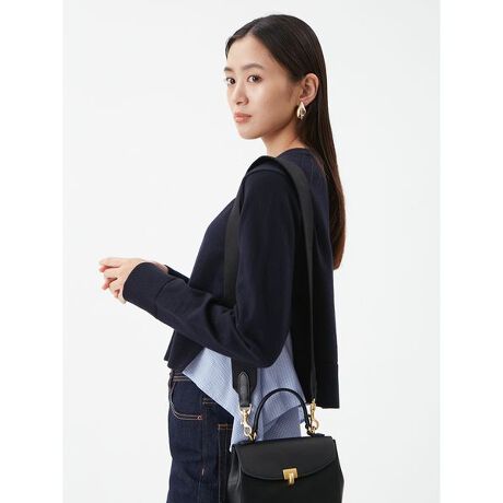 カシミヤ混のコットン糸を使用した肌ざわりのよいニットをベースに、布帛素材をドッキングさせた、モードな印象のプルオーバー。
