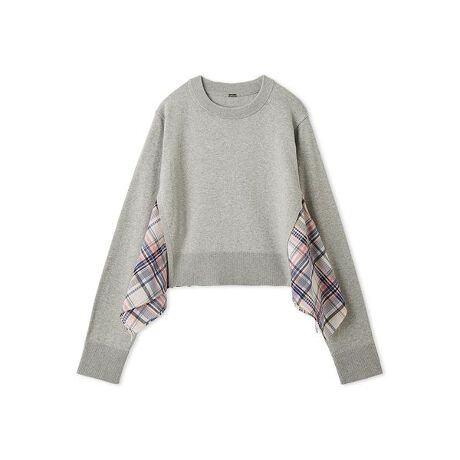 カシミヤ混のコットン糸を使用した肌ざわりのよいニットをベースに、布帛素材をドッキングさせた、モードな印象のプルオーバー。