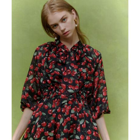 滑らかなサテンジョーゼットの生地にチェリーをのせた可愛らしいプリント。ベーシックなリボンデザインのOPはウエストがシャーリングになっており、着用するだけでブラウジングが完成します。プリントが可愛らしいのでV開きはしっかり開けて大人っぽくも着こなせるようにしています。リボンの巾も太すぎず細すぎず結び方で雰囲気を変えていただけます。