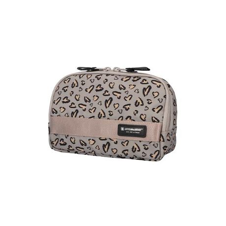 クラシックなレオパード柄に愛らしいハートをちりばめた、「アルティザン・アンド・アーティスト」オリジナルプリントのシリーズ。エレガンスと遊び心、甘さとシックさのバランスが魅力的なデザインです。こちらは、スロープ形状が特徴のポーチ。トップからの斜めのカッティングによって、スマートかつコンパクトながら収納力も両立しています。ファスナーを開くとフロント部分の上半分が手前に倒れるつくりで、中身が見渡しやすいうえ、中に入れたアイテムの出し入れもスムーズです。2つのブラシホルダー、スティックアイテム用ポケット付き。ホルダーとポケットの向き・位置は、手前と奥とで交互に配置されており、ファスナーを閉じたときにアイテムの厚い(太い)部分同士が重なるのを防げるため、スペースを有効利用できます。※写真はイメージです。実際はポーチのみの販売となります<商品詳細>・素材:[表]ポリエステル(撥水加工) [裏]ナイロン・サイズ:W180×H110×D60mm・カラー:グレージュ(GBE)・原産国:日本