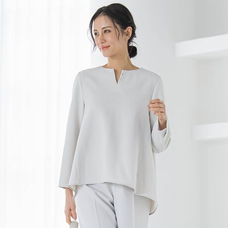 胸元のスリットにあしらったパールパーツが華やかさを添え、シンプルなシルエットに上品なアクセントを加えています。