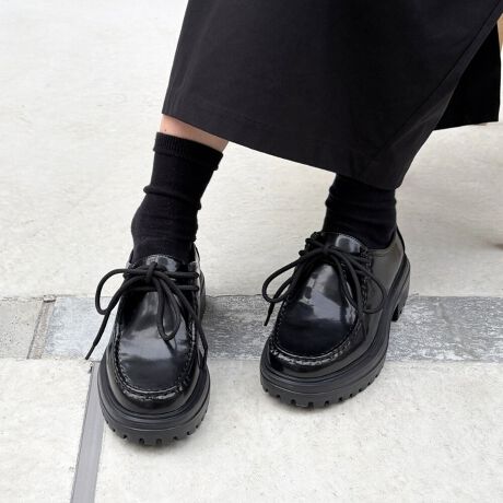 [型番:4450]レースアップマニッシュ。モカシンデザインのローカットシューズ。モカシンがデザインのポイントになり、可愛らしさもプラスされました。素材も光沢のあるガラス素材、足元を引き立たせてくれます。人気のモカシンは、マニッシュとしても活躍できます!デザイン性もある1足で、コーディネートの幅も広がりますね!厚底も嬉しいポイントです。