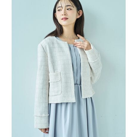 大切なハレの日を彩る、上品な華やかさを醸すミックスツイードノーカラージャケット。