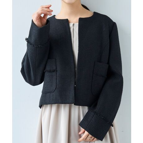 大切なハレの日を彩る、上品な華やかさを醸すミックスツイードノーカラージャケット。