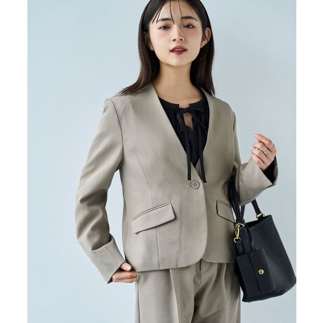 ハレの日の装いにふさわしい、凛とした印象を演出するスタイリッシュなノーカラージャケット。
