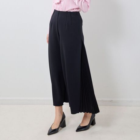 サイドのプリーツ切り替えが表情感のあるスタイリングを演出するパンツ。プリーツ部分は配色になっており、コーディネートのアクセント使いに大活躍してくれます。体型カバーも期待できるゆとりのあるシルエットがポイント。ウエスト周りにタックを寄せることで、上品なムードをプラスします。パンツでありながらスカートのように着こなせるエレガントなアイテムです。