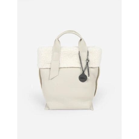 柔らかなモノトーンのフェイクレザーに映えるメタルのロゴチャームが、アクセントに。
