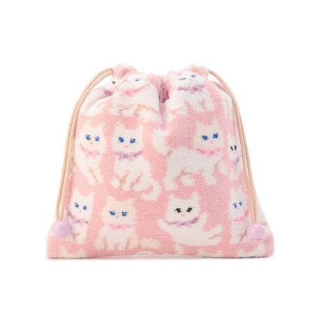 かわいらしいネコたちを描いた『モフモフネコチャン』の巾着。裏地にメッシュ素材を使用し、通気性よく仕上げています。使いやすい適度なサイズ感にしました。手洗い可能も嬉しいポイントのひとつ。トラベルグッズやモバイルグッズを入れたり、コスメやバッグ内の小物をまとめたりと、様々な用途で活躍します。