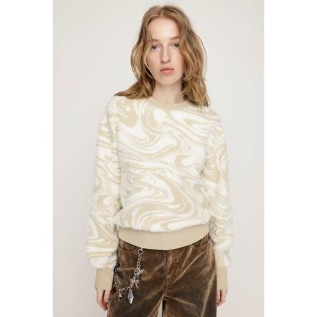 【MIX SHAGGY MARBLE TOPS】■POINT:SLYオリジナルで作成したマーブル柄をシャギー素材で仕上げたニットトップス。シーズンムードを高めるシャギー素材と配色マーブルがスタイリングの主役になるアイテムです。■DETAIL:ボトムスとバランスの取りやすい程よいコンパクトシルエットです。ゆったりとしたシルエットですが襟・袖口・裾はシャープなリブ仕様なので着膨れせず、すっきりとした印象で着用して頂けます。2色の異なる糸を使用したジャガード編みでマーブル柄を表現しています。■STYLING:デニムやスウェットパンツと合わせたカジュアルなスタイリングはもちろん、ミニボトムスとロングブーツでトレンドライクなガーリースタイルもおすすめです。インパクトのあるマーブル柄がアウターのインナーとしても着映えします。■FABRIC/MATERIAL:ナイロンシャギーのニット糸をジャガード編みし、マーブル柄に仕上げました。[注意事項]※画像の商品はサンプルです。実際の商品と仕様、加工が若干異なる場合があります。※画像の商品は光の照射や角度、お使いのモニター環境により、実物と色味が異なる場合がございます。※着用、お取り扱いの際は、アテンションタグをご確認ください。※一部予約商品につきましては生産上の都合によりお届け予定日や店頭発売と前後する場合もございます。※追加生産商品は、一部の店舗、通販で販売中の場合がございます。予めご了承下さい。