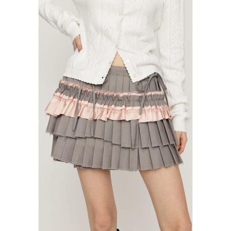 【WRAP PLEATED SKIRT】■POINT:大胆な異素材の切り替えと、アシンメトリーなレイヤードデザインが目を引くミニスカート。スーツ地にチュールやサテンを重ねた立体的なシルエットが、SLYらしいモード感と抜け感を演出します。ひと味違う着こなしが楽しめる、デザイン性たっぷりの主役アイテムです。■DETAIL:フロントにはボタンが施してあり、ウエストを斜めにクロスさせて巻きスカートとしての着用可能。インナーパンツ付きでミニスカートでも映える1枚です。サイドに施したリボンは、垂らしたり結んだり自由にアレンジ可能。動くたびにレイヤーが揺れて、表情豊かな仕上がりに。スーツ地素材を使用しているのでシーズンレスで着用可能なアイテムです。■STYLING:デニムやスウェットパンツに巻きスカートとしてレイヤードしたスタイリングが今季一押し。トップスにはカジュアルなスウェットやメンズライクなアウターと合わせたスタイリングがおすすめです。■FABRIC/MATERIAL:肌触りの良いスーツ地にポリエステルサテン・チュール素材をドッキングしました。■透け感:なし■光沢感:なし■伸縮性:なし■裏 地:インナーパンツあり●本品は裁ち切り始末にしています。着用や洗濯、クリーニングの繰り返しにより、ほつれが増したり、裁ち切り部分が丸まってくる事がありますので、ご了承下さい。ほつれが目立った際はほつれた糸を引っ張ったりせず、カットして下さい。●本品はプリーツ加工を施しています。・加工は着用や洗濯につれて徐々に減少していきますのでご了承下さい。・アイロンやスチームは当てないで下さい。・ドライヤーやストーブ等の熱が当たらないようにご注意下さい。・水洗い表示の際は、軽く押し洗いまたは振り洗いをして下さい。・洗濯後の脱水はネットに入れて短時間処理して下さい。またはタオルで押さえて水気を取って下さい。・洗濯後はすぐにプリーツが広がらないように干して下さい。・ドライ表示の際はクリーニング店へご依頼下さい。[注意事項]※画像の商品はサンプルです。実際の商品と仕様、加工が若干異なる場合があります。※画像の商品は光の照射や角度、お使いのモニター環境により、実物と色味が異なる場合がございます。※着用、お取り扱いの際は、アテンションタグをご確認ください。※一部予約商品につ
