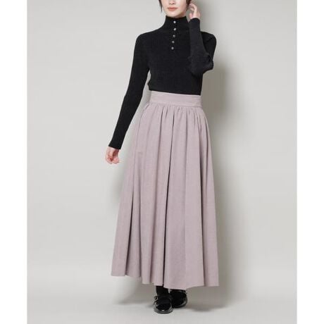 たっぷり入ったギャザーと、ふんわりと広がる美しいフレアシルエットが魅力のロングスカート。ギャザーによる自然な落ち感で、ふくらみ過ぎずスッキリ見えるのも嬉しいポイント。トップスインもしやすく、カジュアルからオフィススタイルまで幅広く活躍する万能アイテムです。
