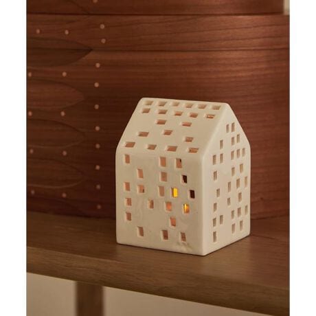 家の形をしたキャンドルホルダーのアーバニアは、中でキャンドルを灯すと、窓から光が漏れているような温かく優しい幻想的な雰囲気が生まれます。窓は1 つ 1 つハンドメイドでくり抜かれており、少しだけ歪な形があたたかみを感じます。